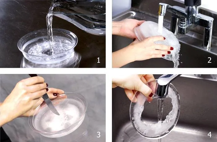 - Примерно через 8-10 часов достаньте контейнеры из морозилки и обдайте дно горячей водой из-под крана (2), чтобы легче было достать лёд.