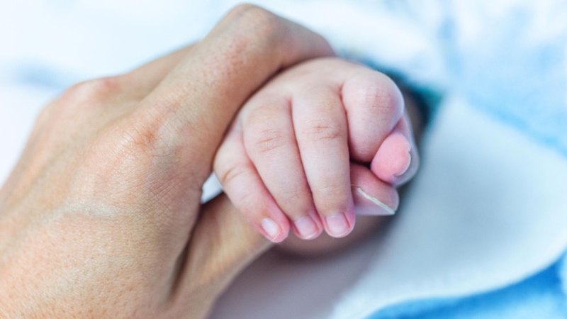 Женщина держит новорожденного за ручку . Архивное фото